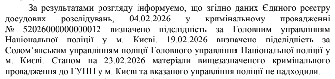 - Зміна підслідності: Щойно суд зобовʼязав Бюро розглянути питання статусу потерпілого, справу було терміново передано до Головного управління Національної поліції у м. Києві, а звідти 23.02.2026 – до рівня районного управління поліції. Це виглядає як свідоме зниження статусу справи, яку саме НАБУ презентувало як масштабну операцію проти агентурної мережі. При цьому, в ГУНП стверджують, що вони не отримали досі матеріали з НАБУ.